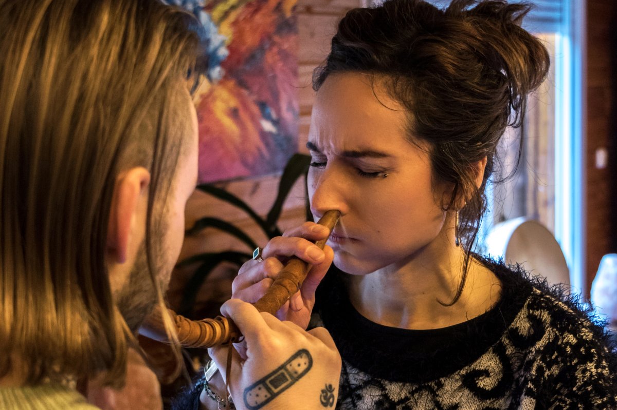 Le rapeh ne se consomme pas seul : il est soufflé dans les narines du receveur à l’aide d’une petite pipe en forme de V appelée tepi (quand une autre personne administre) ou kuripe (en auto-administration). Avant l’application, une intention claire est formulée : purification, clarté, recentrage… Le choc de la poudre dans les sinus provoque souvent larmes, mucosités, vertige, voire vomissements si des charges énergétiques lourdes doivent être évacuées.